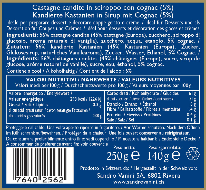 Ingrédients: sucre, châtaignes (26%) eau, sirop de glucose, ethanol, cognac (1.3%), arôme naturel de vanille.